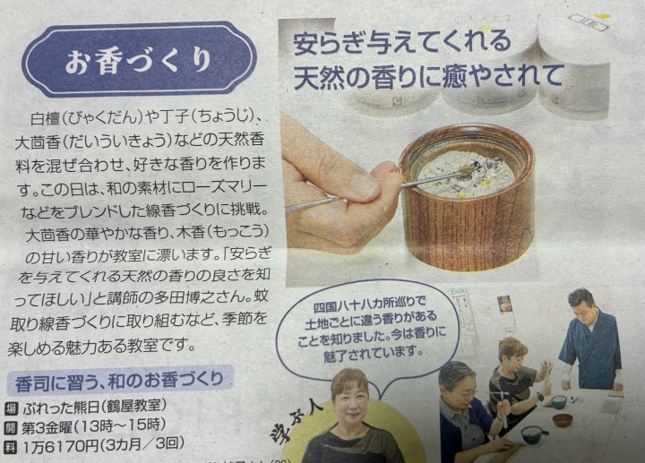 ぷれった熊日鶴屋教室にて、天然の香料だけにこだわった本格的なお香作りの講座を開講いたします。