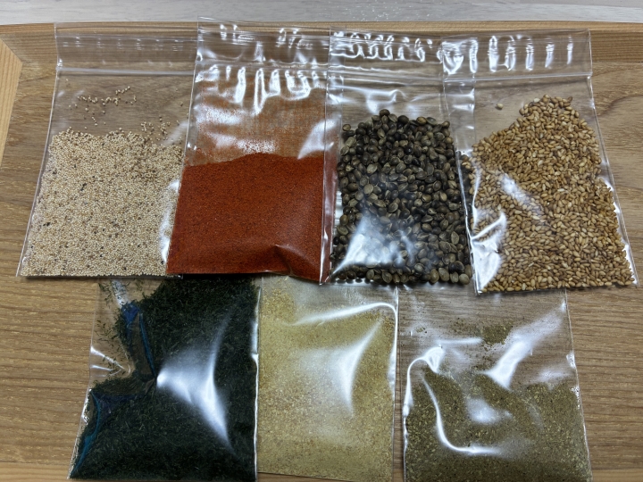 7種類の材料(本鷹唐辛子、山椒、黄胡麻、陳皮、麻の実、けしの実、青のり)をご用意しております。ご自身の好みで辛味を強くしたり、風味豊かに仕上げたりと、お好みに合わせて自由にブレンドしてください。